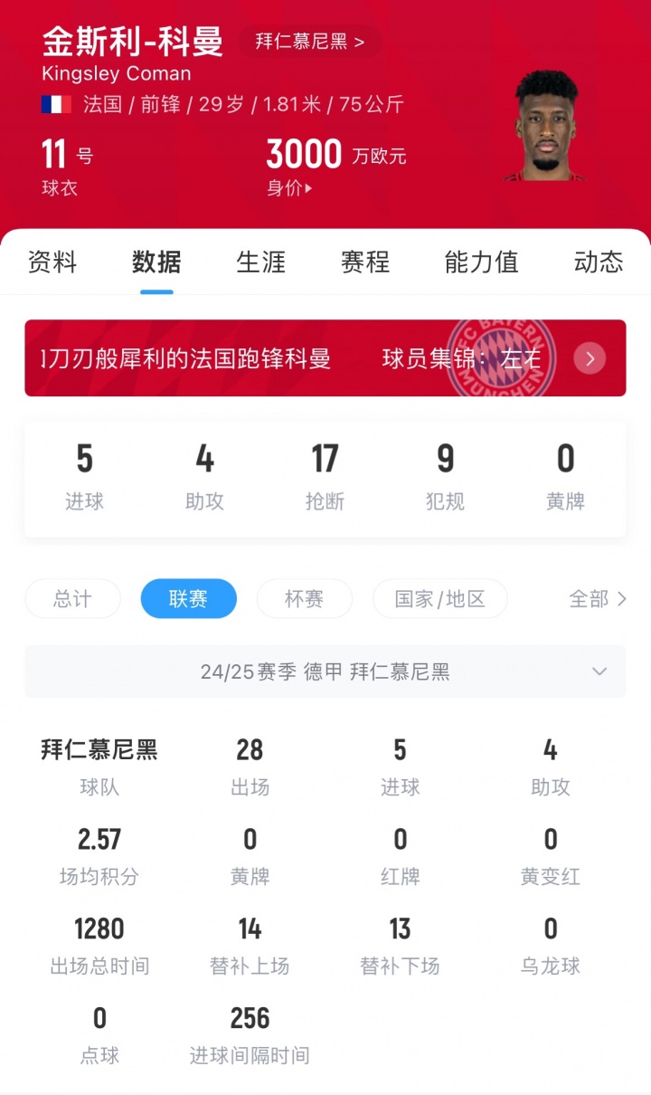 科曼现年29岁,他上赛季为拜仁出场41次,贡献7球4助,他与拜仁的合同将在2027年到期,现身价3000万欧。在今晨与热刺的友谊赛中,科曼为拜仁打进一球。