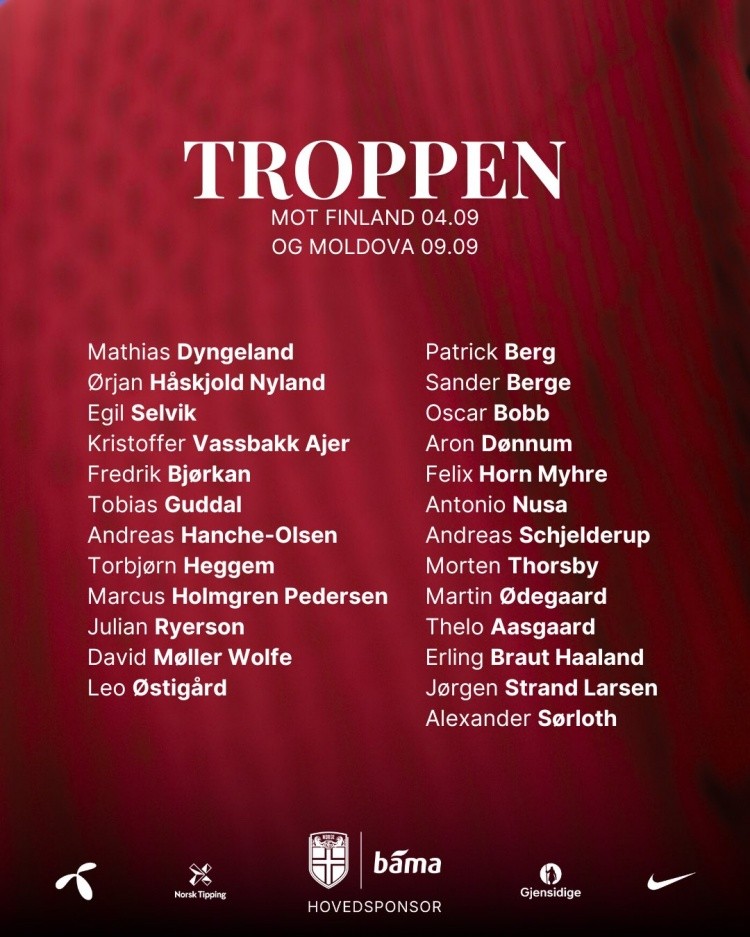 8月26日讯 挪威国家队公布9月份大名单,哈兰德、厄德高领衔。挪威将在9月份对阵芬兰(友谊赛)、摩尔多瓦(世预赛)。