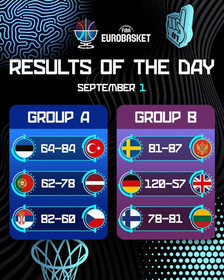 09月02日讯 男篮欧锦赛当地时间9月1日的6场小组赛全部结束,详细赛果如下: